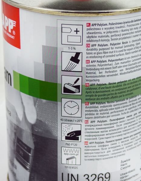 APP РЕ POLY-PLAST средне эластичная, не насыщенная полиэстровая смола, с высокой прочностью. Предназначена для ламинирования ручным способом и методом распыления. Обладает великолепной адгезией к металлу, старым краскам и грунтовкам, полиэфирным ламинатам и дереву. Полученный в процессе ламинирования слой имеет очень высокую устойчивость к механическому напряжению, колебаниям и вибрации, а также устойчив к высокой температуре, действию масел, смазок и бензина. В состав входит полиэстровая смола с отвердителем. В соединении со стеклотканью или стекломатом имеет следующее применение: